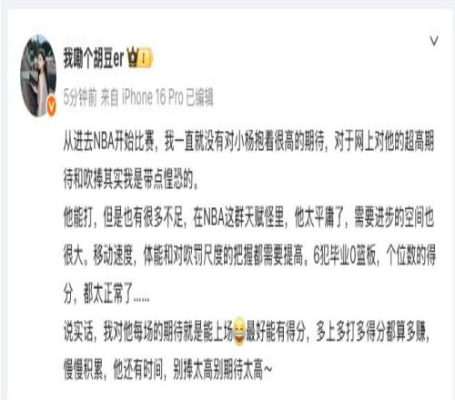 雷速体育10月17日讯 NBA季前赛,开拓者129-132惜败爵士。 本场比赛,中国球员杨瀚森在第四节早早六犯离场,全场他出战15分钟,砍下了3分1助攻1抢断1盖帽,并出现了3次失误。 赛后,媒体人“我嘞个胡豆er”点评了杨瀚森的表现: 从进去NBA开始比赛,我一直就没有对小杨抱着很高的期待,对于网上对他的超高期待和吹捧其实我是带点惶恐的。 他能打,但是也有很多不足,在NBA这群天赋怪里,他太平庸了,需要进步的空间也很大。移动速度,体能和对吹罚尺度的把握都需要提高。6犯毕业0篮板,个位数的得分,都太正常了…… 说实话,我对他每场的期待就是能上场,最好能有得分,多上多打多得分都算多赚,慢慢积累,他还有时间,别捧太高别期待太高~ |