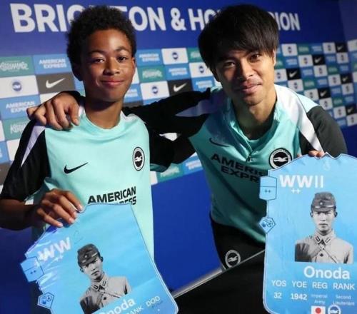 论球技,三笘薰人称“三球王”,确实是当今亚洲足坛最优秀的球员之一,也是孙兴慜离开之后,亚洲球员在英超的代表。然而论人品,就不怎么样了! 英超每年都会在11月11日左右举办第一次世界大战停战的活动。11月27日,布莱顿俱乐部组织青年球员参加这项活动,三笘薰与一位日裔的黑人小球员一起合影。 然而令人震惊并且愤怒的是,三笘薰和这位小球员举着卡片上,赫然印着日本二战战犯小野田宽郎的照片!而且他们都认为小野田宽郎是日本的英雄。