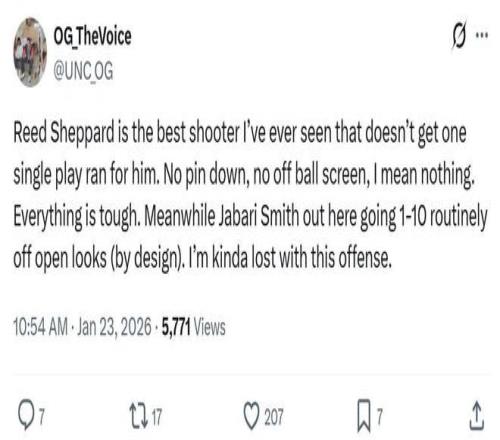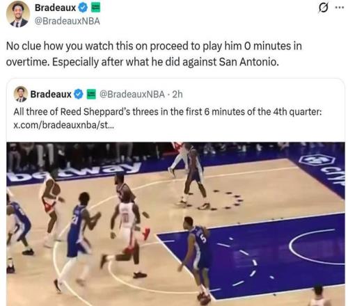 并不是只有Bradeaux一位火箭媒体人感到不解,大量火箭媒体人与当地资深球迷发声表达质疑,不理解为何谢泼德如此出色的三分手,却在进攻体系中完全无法获得任何战术安排。 甚至连基本的掩护都没有,反而乌度卡不断给10中1的小贾巴里史密斯设计专门的进攻战术。